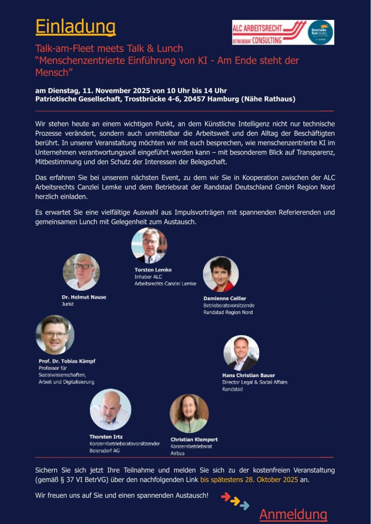 Talk-am-Fleet ist eine Veranstaltungsreihe der ALC Arbeitsrechts Canzlei Lemke speziell ausgerichtet auf die Fortbildung und Schulung von Betriebsräten und Personalräten.